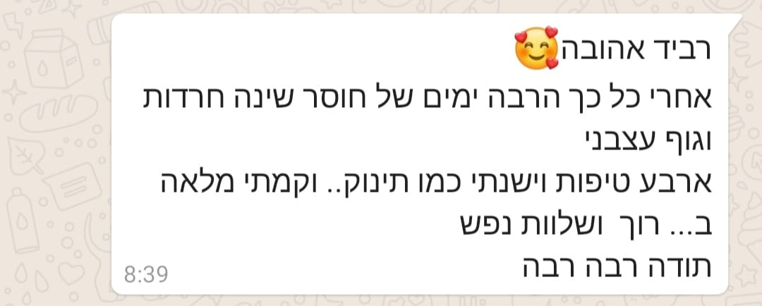 כבר למעלה מ-15 שנה אני פונה לרביד לעזרה ולתמיכה גם בדברים קטנים וגם במצבים משמעותיים וצמתים חשובים עבורי ועבור המטופלים שלי. רביד מטפלת מוכשרת, חכמה ומדוייקת. אני סומכת עליה לחלוטין לכל אורך התהליך, מהאבחון ועד סיום הטיפול.